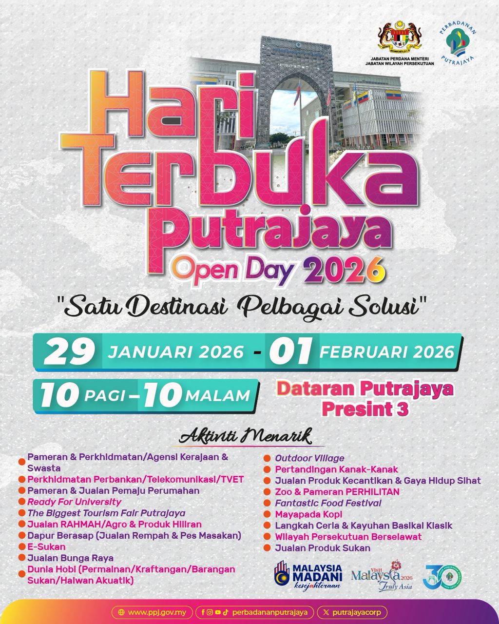 Dengan segala hormatnya adalah dimaklumkan bahawa Perbadanan Putrajaya (PPj) akan menganjurkan Hari Terbuka Putrajaya (Putrajaya Open Day – POD) 2026 pada 29 Januari hingga 1 Februari 2026 bertempat di Dataran Putrajaya dan Kompleks Perbadanan Putrajaya, Presint 3, Putrajaya.